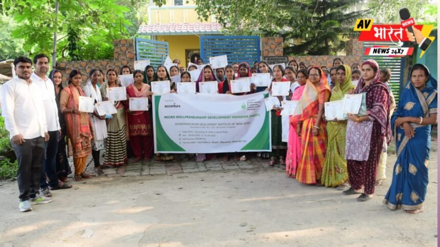 भगवानपुर प्रखंड के बसही में एंटरप्रेन्योरशिप डेवलपमेंट इंस्टिट्यूट ऑफ़ इंडिया अहमदाबाद के द्वारा सूक्ष्म कौशल उद्यमिता विकास कार्यक्रम के अंतर्गत 26 दिवसीय प्रशिक्षण कार्यक्रम के अंतिम दिवस में लाभार्थियों के बीच एम एस डी पी प्रशिक्षण का प्रमाणपत्र वितरण किया गया । 26 दिवसीय प्रशिक्षण के दौरान प्रशिक्षुओं को लैपटॉप बैग ,शॉपिंग बैग तथा बहुउद्देश्यीय बैग बनाने संबंधित प्रशिक्षण के साथ साथ महिलाओं में उद्यमिता विकास को विकसित करने संबंधित प्रशिक्षण बिभिन्न प्रशिक्षकों द्वारा दिया गया। महिलाओं में उद्यमिता विकास को विकसित करने संबंधित प्रशिक्षण बिभिन्न टॉपिक तथा गतिविधियों के माध्यम से संस्था के प्रोजेक्ट कोऑर्डिनेटर प्रणव कुमार तिवारी के द्वारा दिया गया। पूरे प्रशिक्षण के दौरान बिभिन्न प्रकार के क्रिया कलापों को प्रेजेंटेशन के माध्यम से दर्शाने का प्रयास किया गया।संस्था द्वारा 65 महिला उद्यमियों को एम एस डी पी प्रशिक्षण का प्रमाणपत्र का वितरण कार्यक्रम के मुख्य अतिथि स्टार्टअप एडवाइजर तथा फ्रीलांसर मानस प्रकाश उपाध्याय तथा संस्था के प्रोजेक्ट कोऑर्डिनेटर प्रणव कुमार तिवारी द्वारा किया गया।कार्यक्रम के मुख्य अतिथि मानस प्रकाश उपाध्याय ने महिलाओं को सूक्ष्म उद्योग का स्टार्टअप कैसे करें,विषय पर चर्चा किया तथा साथ ही बताया कि अगर महिलाओं के अंदर उद्यमी बनने की ललक है तो बैंक भी हर तरह से महिलाओं को सपोर्ट करने को तैयार है। प्रोजेक्ट कोऑर्डिनेटर प्रणव कुमार तिवारी ने बताया कि संस्था अगले 16 महीनों तक महिला उद्यमियों को उनके उत्पादों के प्रोडक्ट डेवेलपमेंट,बिजनेस डेवेलपमेंट, मार्केट लिंकेज तथा बैंक लिंकेज आदि में सहयोग करेगी।,तथा बिभिन्न प्रकार के स्टॉल तथा मेलों(एग्जीबिशन) के द्वारा बाजार की उपलब्धता सुनिश्चित करेगी।कार्यक्रम के दौरान समाज सेविका मीना देवी ने भी महिलाओं का उत्साहवर्धन किया,तथा उज्ज्वल भविष्य की कामना की। कार्यक्रम के अंत मे सभी महिला उद्यमियों ने ई डी आई आई संस्था के प्रोजेक्ट डायरेक्टर डॉ रमन गुजराल को इस प्रकार के प्रशिक्षण के माध्यम से महिलाओं को आत्मनिर्भर बनाने के लिए धन्यवाद दिया ।