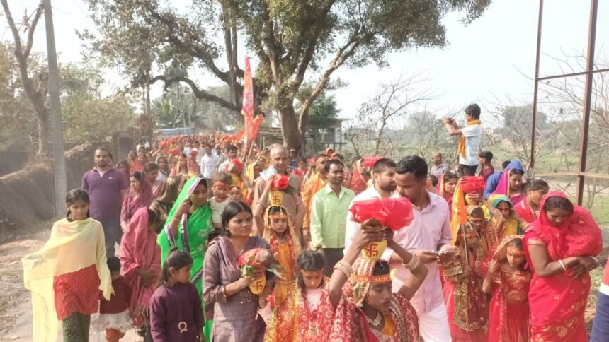 वीरपुर पंचमुखी चौक वीरपुर के नजदीक मां भगवती पूजा समिति के द्वारा भगवती की प्राण प्रतिष्ठा व अष्टयाम को लेकर गुरुवार को 151 कुवांरी कन्याओं के द्वारा कलश यात्रा निकाली गई।उक्त कलश यात्रा यज्ञ स्थल से शुरू होकर मुरादपुर,फजिलपुर व रोस्तामा के रास्ते होते हुए पुनः यज्ञ स्थल पर पहुंच कर समाप्त किया गया।इस दौरान भगवती की प्रतिमा को रथ पर सवार कर व ढोल नगाड़ों के साथ नगर भ्रमण करवाया गया।जिसे स्थानीय लोगों ने भव्य स्वागत किया।