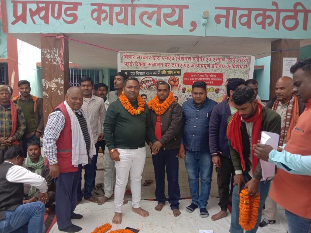प्रतिशोध सभा को रजाकपुर मुखिया प्रतिनिधि मुकेश पासवान,नंदकिशोर पासवान,अर्जुन पासवान आदि ने संबोधित किया।मांगें इस प्रकार हैं- -एन एच एवं एस एच पर ई रिक्शा संचालन पर लगाए गए प्रतिबंध को तत्काल प्रभाव से वापस लिया जाए। यदि पूर्ण संचालन संभव न हो तो निश्चित समय एवं लेन में ई रिक्शा चलाने की अनुमति दी जाए।